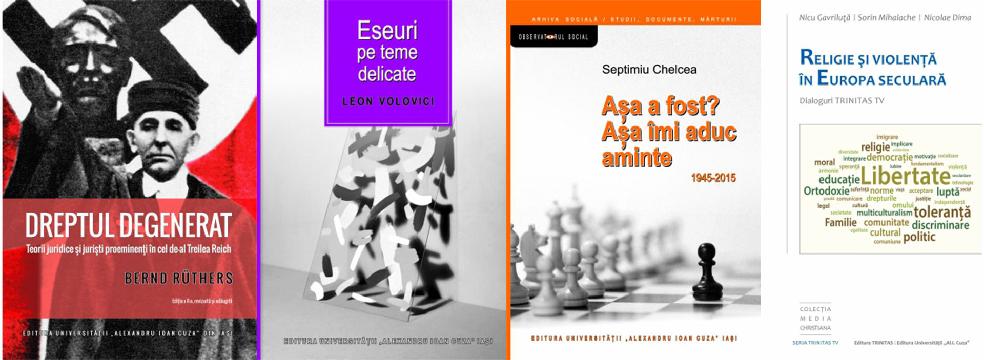 Nazismul și Antichitatea, de Johann Chapoutot; Dreptul degenerat. Teorii juridice şi jurişti proeminenţi în cel de-al Treilea Reich, de Bernd Rüthers; Eseuri pe teme delicate, de Leon Volovici; Așa a fost? Așa îmi aduc aminte. 1945-2015, de Septimiu Chelcea; Religie și violență în Europa seculară. Dialoguri la Trinitas TV, de Nicu Gavriluță, Nicolae Dima, Sorin Mihalache