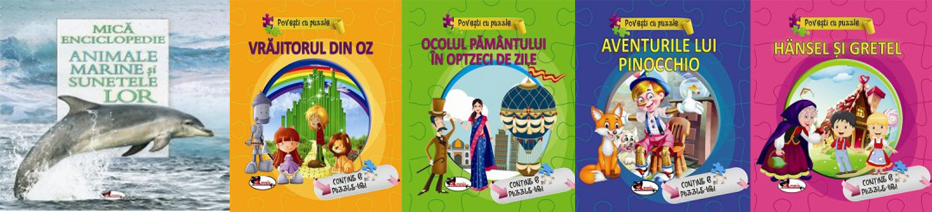 Animale marine și sunetele lor; Povești cu puzzle - Vrăjitorul din Oz; Povești cu puzzle - Ocolul Pământului în 80 de zile; Povești cu puzzle - Aventurile lui Pinocchio; Povești cu puzzle - Hänsel și Gretel.