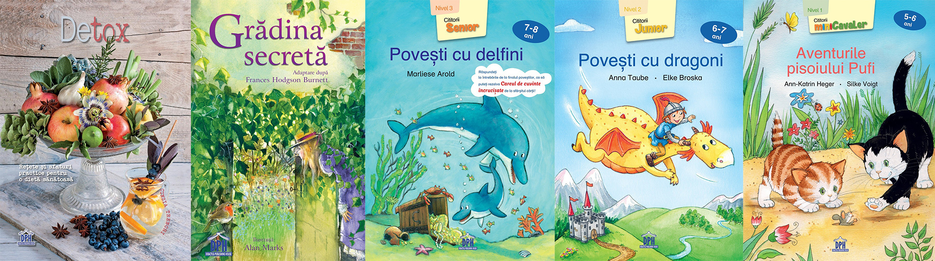 Detox, de Cinzia Trenchi; Grădina secretă, de Frances Hodgson Burnett; Povești cu delfini, de Marliese Arold; Povești cu dragoni, de Anna Taube, Elke Broska; Aventurile pisoiului Pufi, de Ann-Katrin Heger, Silke Voigt.