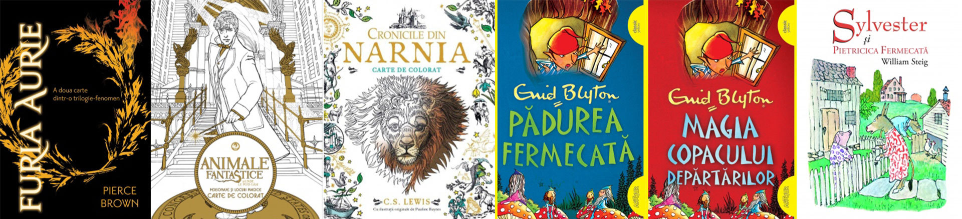 Furia Aurie, de Pierce Brown; Animale fantastice și unde le poți găsi (carte de colorat); Cronicile din Narnia (carte de colorat); Pădurea fermecată, de Enid Blyton; Magia Copacului Depărtărilor, de Enid Blyton; Sylvester și pietricica fermecată, de William Steig.