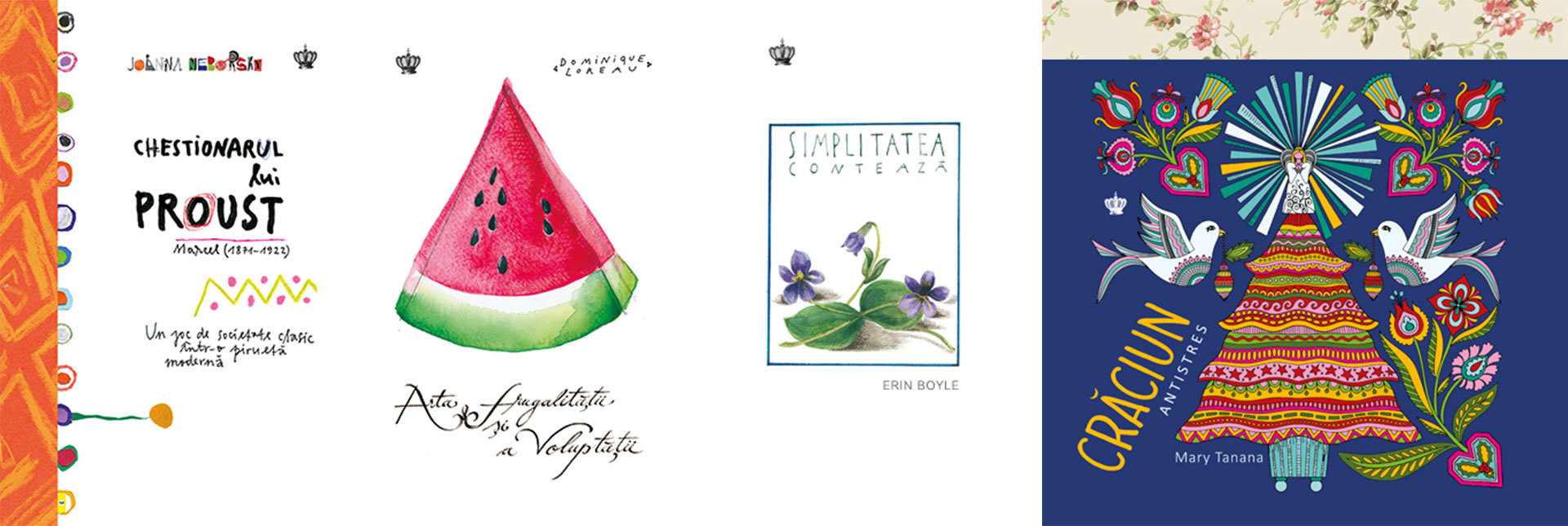Chestionarul lui Proust, de Joanna Neborsky; Simplitatea contează, de Erin Boyle; Arta frugalităţii şi a voluptăţii, de Dominique Loreau; Crăciun Antistres (bloc de colorat antistres), ilustraţii: Mary Tanana.