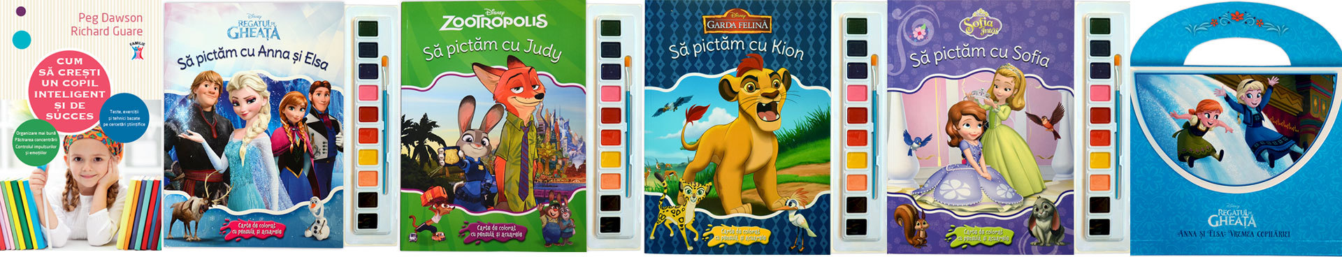 Cum să crești un copil inteligent și de succes, de Peg Dawson, Richard Guare; Regatul de gheață. Să pictăm cu Anna si Elsa. Carte de colorat cu pensulă și acuarele, ed. Disney; Zootropolis. Să pictăm cu Judy. Carte de colorat cu pensulă și acuarele, ed. Disney; Garda Felină. Să pictăm cu Kion. Carte de colorat cu pensulă și acuarele, ed. Disney; Sofia Întâi. Să pictăm cu Sofia. Carte de colorat cu pensulă și acuarele, ed. Disney; Regatul de gheață. Anna și Elsa: Vremea copilăriei - poșetuță, ed. Disney.