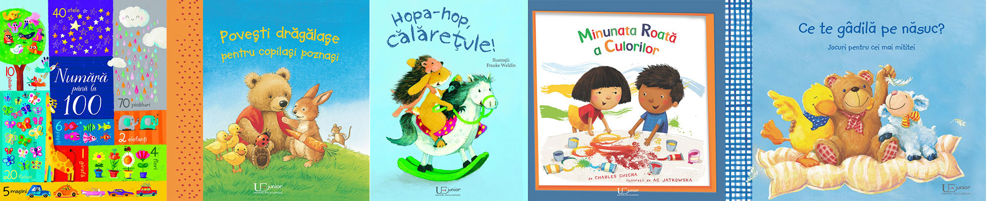 Numără până la 100, de Felicity Brooks, Sophia Touliatou; Povești drăgălașe pentru copilași poznași, de Marlis Scharff-Kniemeyer, Sabine Cuno; Hopa-Hop, Călărețule, de Frauke Weldin; Minunata roată a culorilor, de Charles Ghigna; Formele sunt peste tot!, de Charles Gigna; Ce te gâdilă pe năsuc?, de Anna Karina Birkenstock; Marea carte a numerelor, de Felicity Brooks; Șoricelul care visa să devină liliac; Bună dimineața!, de Jelena Brezovec, Kim Crockett-Corson.