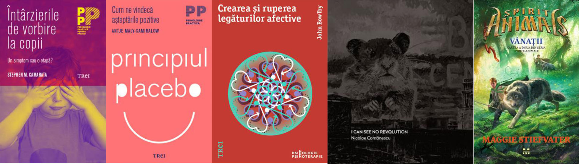 Întârzierile de vorbire la copii. Un simptom sau o etapă?, de Stephen M. Camarata; Principiul placebo. Cum ne vindecă așteptările pozitive, de Antje Maly - Samiralow; Crearea și ruperea legăturilor afective, de John Bowlby; I can see no revolution, de Nicolae Comănescu; Vânații. Spirite-Animale 2, de Maggie Stiefvater.