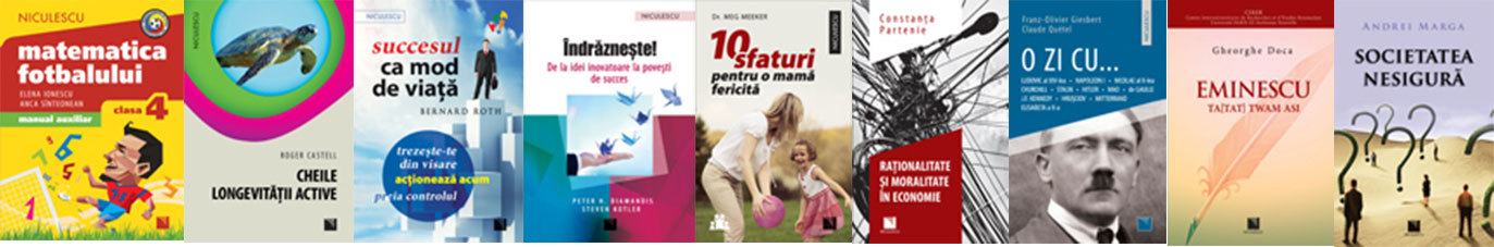 Matematica fotbalului. Manual auxiliar clasa a IV-a. Probleme şi exerciţii din lumea fotbalului pentru băieţi, de Elena Ionescu, Anca Sînteonean; Îndrăzneşte! De la idei inovatoare la poveşti de succes, de Peter H. Diamandis, Steven Kotler; Cheile longevităţii active, de Roger Castell; 10 sfaturi pentru o mamă fericită, de Dr. Meg Meeker; Succesul ca mod de viaţă. Trezeşte-te din visare, acţionează acum, preia controlul!, de Bernard Roth; O ZI CU... Ludovic al XIV-lea, Napoleon I, Nicolae al II-lea, Churchill, Stalin, Hitler, Mao, de Gaulle, J.F. ..., de Franz-Olivier Giesbert, Claude Quétel; Raţionalitate şi moralitate în economie, de Constanţa Partenie; Eminescu Ta[Tat] twam asi „Ace(a)sta eşti tu” - texte eminesciene, de Gheorghe Doca; Societatea nesigură, de Andrei Marga.