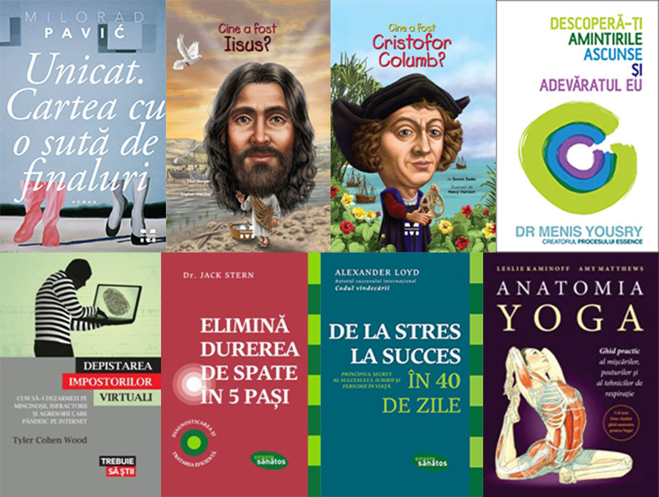 TREI – Unicat. Cartea cu o sută de finaluri, de Milorad Pavić; Cine a fost Iisus Hristos, de Ellen Morgan; Cine a fost Cristofor Columb, de Bonnie Bader; Descoperă-ţi amintirile ascunse şi adevăratul eu, de Menis Yousry; Anatomia YOGA. Ghid practic al mişcărilor, posturilor şi al tehnicilor de respiraţie, de Leslie Kaminoff; Depistarea impostorilor virtuali, de Tyler Cohen Wood; Elimină durerea de spate în 5 paşi, de Jack Stern; De la stres la succes în 40 de zile. Principiul secret al succesului, iubirii şi fericirii în viaţă, de Alexander Loyd.