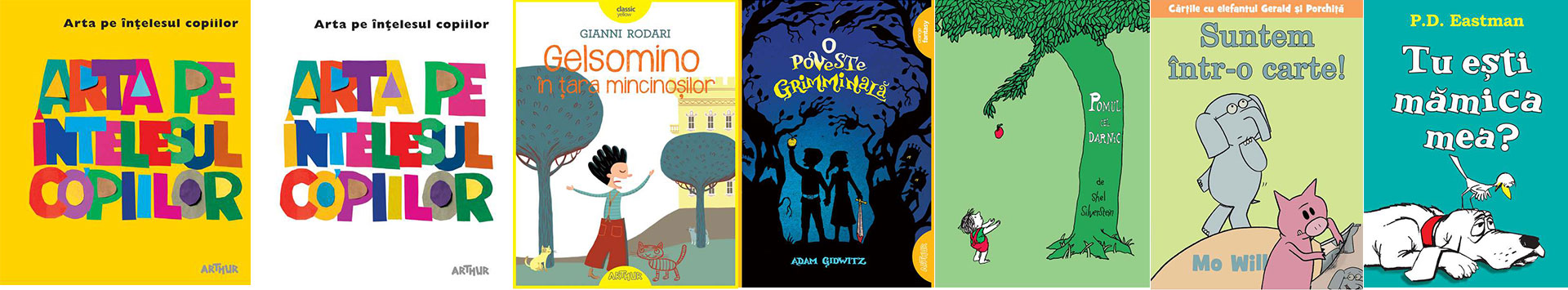 Arta pe înțelesul copiilor. Cartea galbenă, de Amanda Renshaw; Arta pe înțelesul copiilor. Cartea albă, de Amanda Renshaw; Gelsomino în țara mincinoșilor, de Gianni Rodari; O poveste grimminală, de Adam Gidwitz; Pomul cel darnic, de Shel Silverstein; Suntem într-o carte!, de Mo Willems; Tu ești mămica mea?, de P. D. Eastman.