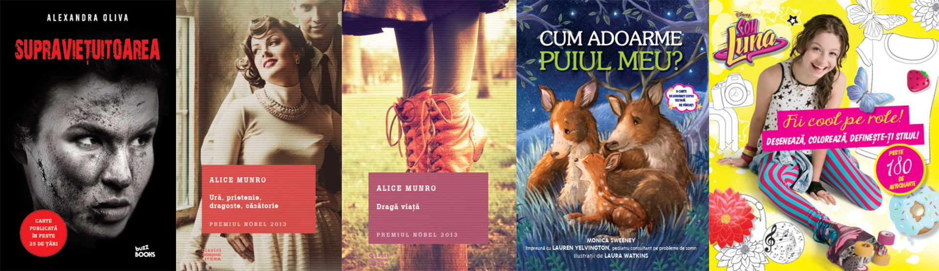 Supraviețuitoarea, de Alexandra Oliva; Ură, prietenie, dragoste, căsătorie, de Alice Munro; Dragă viață, de Alice Munro; Cum adoarme puiul meu?, de Monica Sweeney; Soy Luna. Fii cool pe role! Desenează, colorează, definește-ți stilul!, ed. Disney.