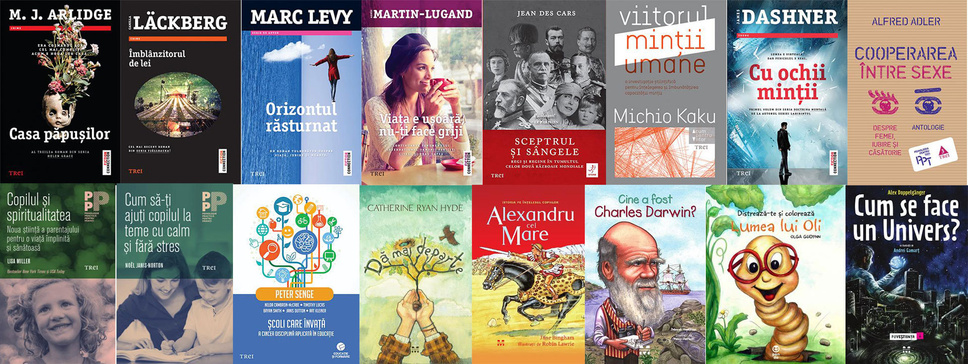 Casa păpușilor, de M.J. Arlidge; Îmblânzitorul de lei, de Camilla Läckberg; Orizontul răsturnat, de Marc Lévy; Viața e ușoară, nu-ți face griji, de Agnès Martin-Lugand; Sceptrul și sângele: Regi și regine în tumultul celor două Războaie Mondiale, de Jean des Cars; Viitorul minții umane, de Michio Kaku; Cu ochii minții, de James Dashner; Copilul și spiritualitatea. Noua știință a parentajului pentru o viață împlinită și sănătoasă, de Lisa Miller; Cum să-ți ajuți copilul la teme cu calm și fără stres, de Noel Janis-Norton; Cooperarea între sexe. Despre femei, iubire și căsătorie, de Alfred Adler; Școli care învață. A cincea disciplină aplicată în educație, coord. Peter Senge, Nelda Cambron-Mccabe, Timothy Lucas, Bryan Smith, Janis Dutton, Art Kleiner; Dă mai departe, de Catherine Ryan Hyde; Alexandru cel Mare, de Jane Bingham; Cine a fost Charles Darwin?, de Deborah Hopkinson; Distrează-te și colorează Lumea lui Oli, de Olga Gudynn; Cum se face un Univers. Poveștiința 1, de Alex Doppelgänger.