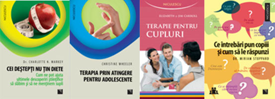 Cei deştepţi nu ţin diete. Cum ne pot ajuta ultimele descoperiri ştiinţifice să slăbim şi să ne menţinem supli, de Charlotte N. Markey; Terapia prin atingere pentru adolescente, de Christine Wheeler; Terapie pentru cupluri, de Elizabeth şi Jim Carroll; Ce întrebări pun copiii şi cum să le răspunzi, de Miriam Stoppard.