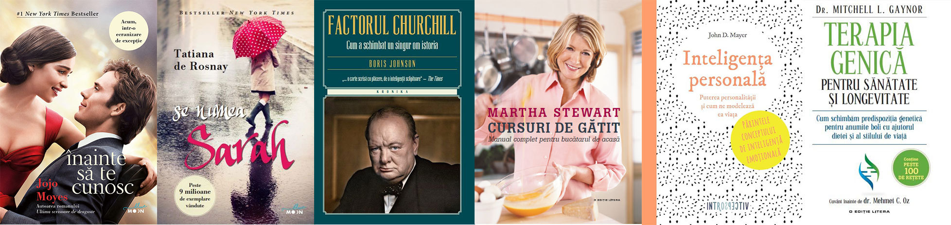 Înainte să te cunosc, de Jojo Moyes; Se numea Sarah, de Tatiana De Rosnay; Factorul Churchill. Cum a schimbat un singur om istoria, de Boris Johnson; Martha Stewart. Cursuri de gătit. Manual complet pentru bucătarul de acasă; Inteligența personală, de John D. Mayer; Terapia genică pentru sănătate și longevitate, de Dr. Mitchell L. Gaynor.