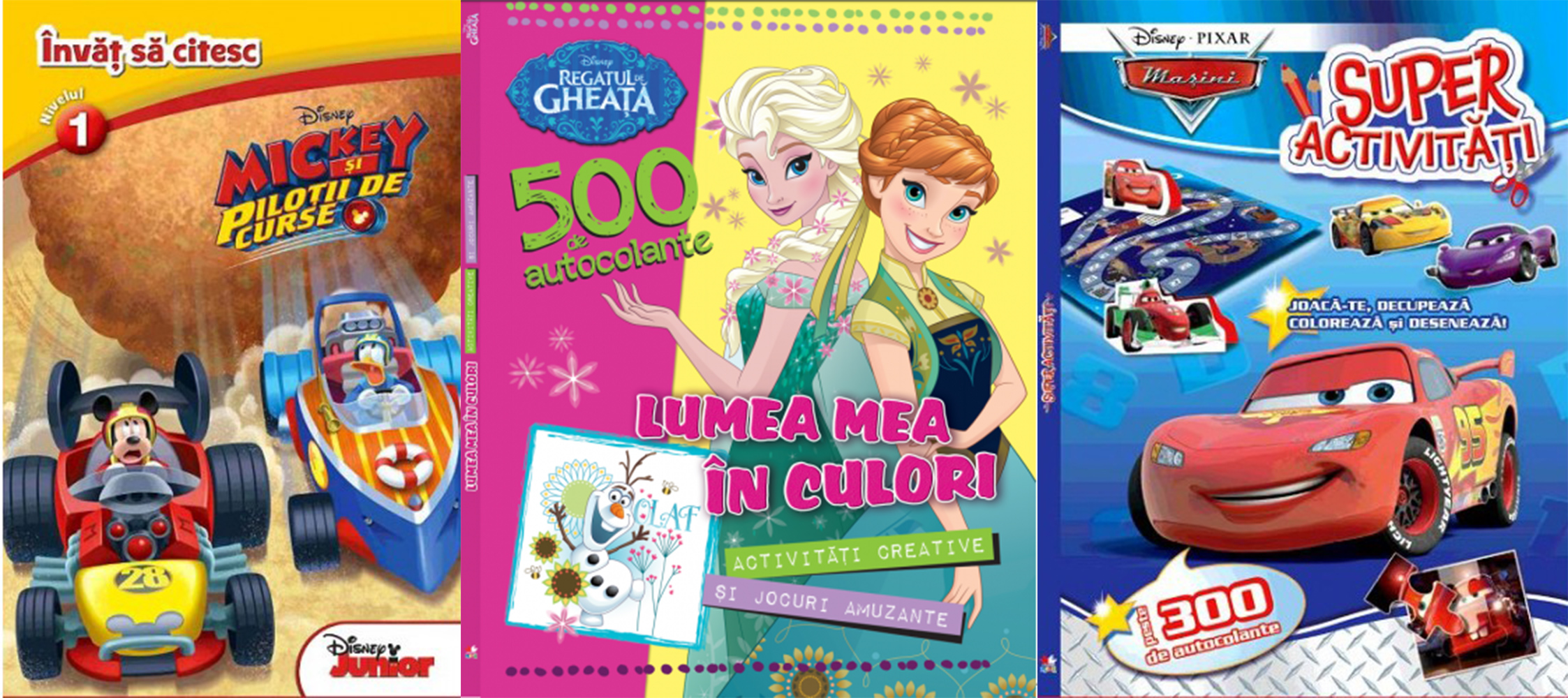 Învăț să citesc. Mickey și piloții de curse, ed. Disney; Regatul de gheață 500 de autocolante. Lumea mea în culori (Decor Art), ed. Disney; Mașini. Superactivități. Peste 300 de autocolante, ed. Disney.