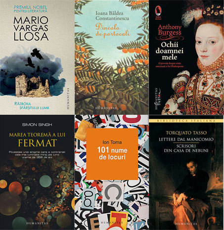 GRUPUL HUMANITAS – Marea teoremă a lui Fermat, de Simon Singh; 101 nume de locuri, de Ion Toma, Lettere dal manicomio/Scrisori din casa de nebuni, de Torquato Tasso, Războiul sfârșitului lumii, de Mario Vargas Llosa, Dincolo de portocali, de Ioana Bâldea Constantinescu și Ochii doamnei mele, de Anthony Burgess, un nou roman din colecția „Raftul Denisei”.