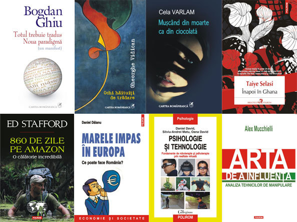 CARTEA ROMÂNEASCĂ ȘI POLIROM – Totul trebuie tradus: Noua paradigmă (un manifest), de Bogdan Ghiu (eseu); Ochi hăituiți de trădare, Gheorghe Vidican (poezie); Mușcând din moarte ca din ciocolată, de Acela Varlam (proză); Înapoi în Ghana, de Taiye Selasi (roman); 860 de zile pe Amazon: O călătorie incredibilă, de Ed Stafford; Marele impas în Europa: Ce poate face România? (literatură de călătorie); de Daniel Dăianu (economie); Psihologie și tehnologie: Fundamente de roboterapie și psihoterapie prin realitate virtuală, de Daniel David, Silviu-Andrei Matu și Oana David (psihologie); Arta de a influența: Analiza tehnicilor de manipulare, de Alex Mucchielli (comunicare).