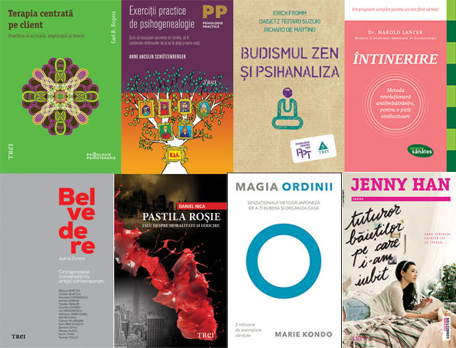 GRUPUL TREI – mai multe apariții în colecțiile de psihologie: Terapia centrată pe client. Practica ei actuală, implicaţii și teorie, de Carl R. Rogers; Exerciţii practice de psihogenealogie. Cum să descoperi secretele de familie, să fii credincios strămoşilor tăi şi să îţi alegi propria viaţă, de Anne Ancelin Schützenberger; Budismul Zen şi psihanaliza, de Erich Fromm, Daisetz Teitaro Suzuki, Richard de Martino; un nou roman Young Fiction Connection: Tuturor băieţilor pe care i-am iubit, Jenny Han; două cărți în afara colecțiilor: Belvedere. Cincisprezece conversaţii cu artişti contemporani, de Adina Zorzini și Pastila roşie: Eseu despre moralitate şi fericire, de Daniel Nica; și două apariții noi la Editura LifeStyle Publishing: Magia ordinii: Senzaţionala metodă japoneză de a-ţi elibera şi organiza casa, de Marie Kondo; Întinerire: Metoda revoluţionară antiîmbătrânire, pentru o piele strălucitoare, de dr. Harold Lancer.
