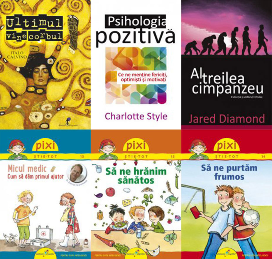 ALL – Ultimul vine corbul, de Italo Calvino; Psihologia pozitivă, de Charlotte Style; Al treilea cimpanzeu, de Jared Diamond; Pixi-știe-tot: Micul medic; Pixi știe tot: Să ne hrănim sănătos; Pixi-știe-tot: Să ne purtăm frumos.