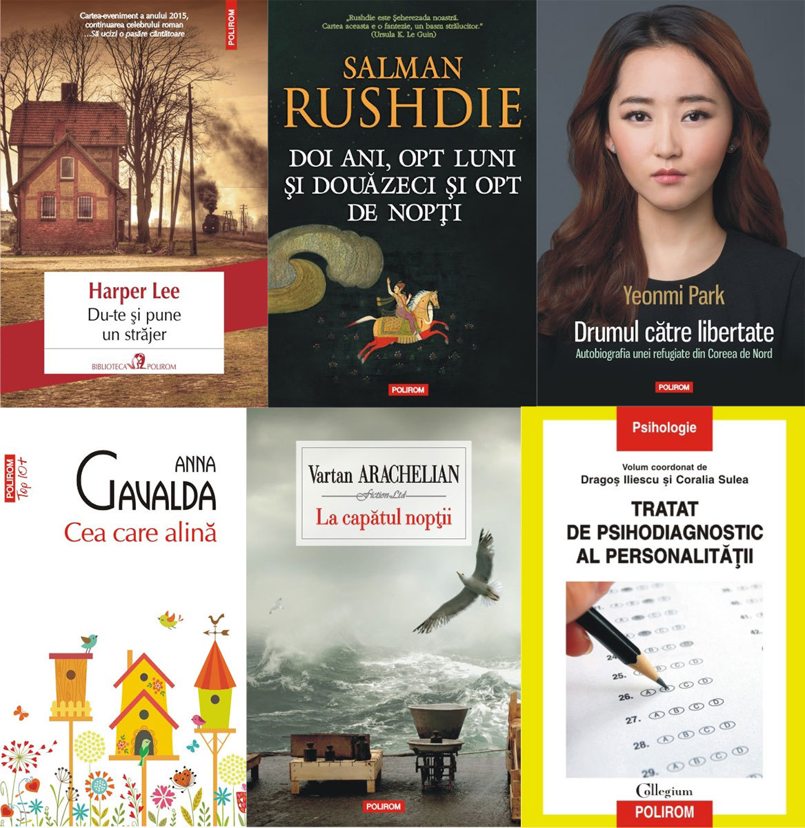 POLIROM – Du-te și pune un străjer, de Harper Lee; Doi ani, opt luni și douăzeci și opt de nopți, de Salman Rushdie; Drumul către libertate. Autobiografia unei refugiate din Coreea de Nord, de Yeonmi Park; Cea care alină, de Anna Gavalda; La capătul nopții, de Vartan Arachelian; Tratat de psihodiagnostic al personalității, de Dragos Iliescu (coord.), Coralia Sulea (coord.).