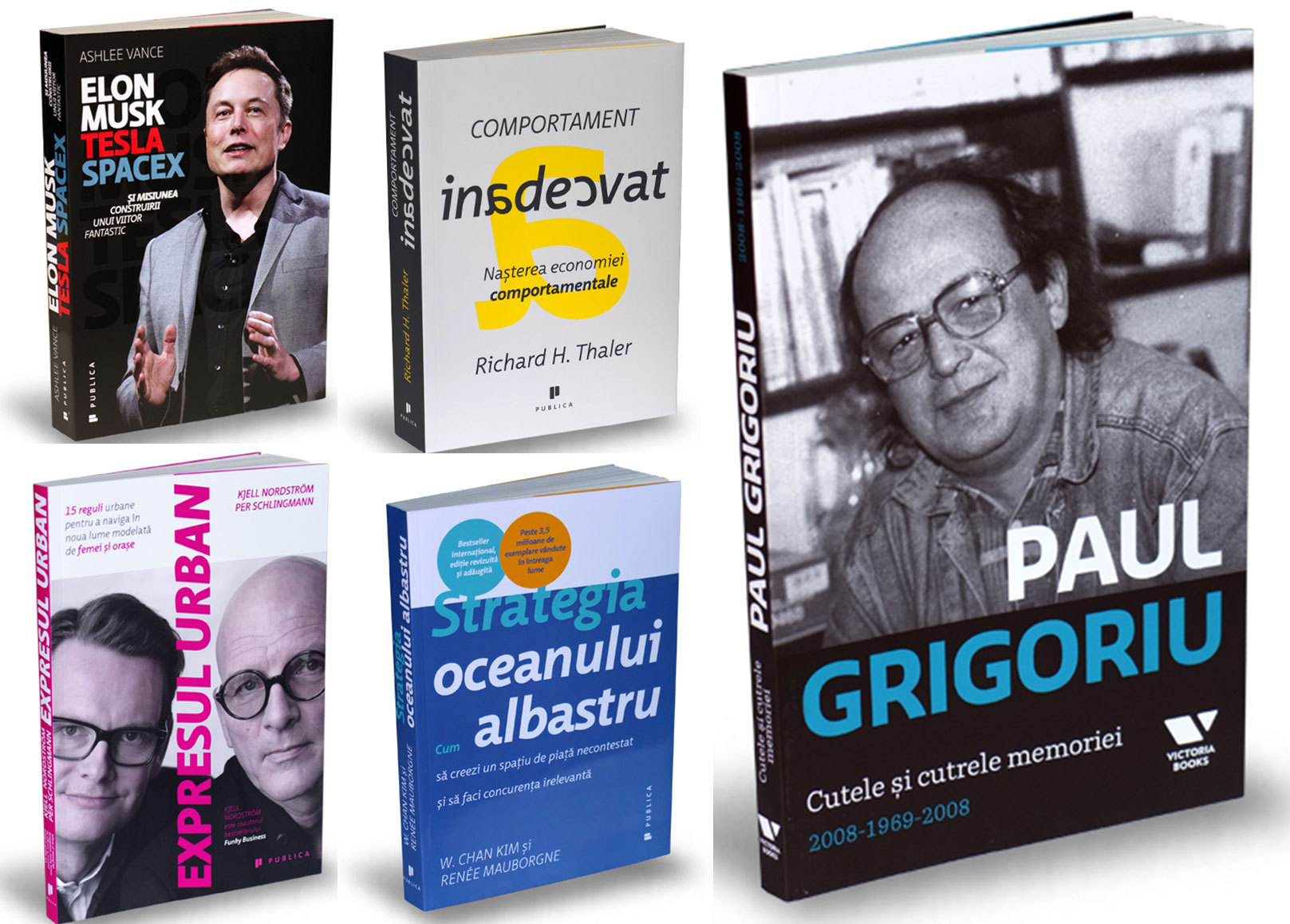 PUBLICA – Elon Musk: Tesla, SpaceX şi misiunea construirii unui viitor fantastic, de Ashlee Vance; Comportament inadecvat: Naşterea economiei comportamentale, de Richard H. Thaler; Expresul urban: 15 reguli urbane pentru a naviga în noua lume modelată de femei şi oraşe, de Kjell Nordström și Per Schlingmann; Strategia oceanului albastru: Cum să creezi un spaţiu de piaţă necontestat şi să faci concurenţa irelevantă, de W. Chan Kim şi Renée Mauborgne; Cutele şi cutrele memoriei 2008-1969-2008, de Paul Grigoriu.