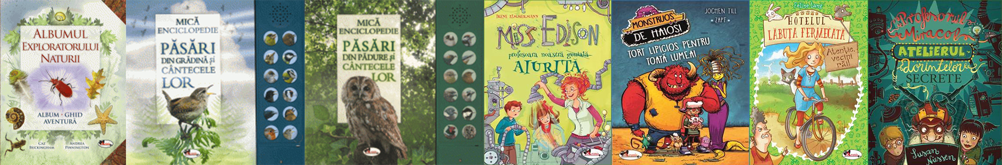 Albumul exploratorului naturii, de Caz Buckingham, Andrea Pinnington; Mică enciclopedie. Păsări din grădină și cântecele lor (carte cu sunete reale, înregistrate în mijlocul naturii); Mică enciclopedie. Păsări din pădure și cântecele lor (carte cu sunete reale, înregistrate în mijlocul naturii); MISS EDISON. profesoara noastră genială. AIURITĂ, de Irene Zimmermann; MONSTRUOS DE HAIOS! Tort lipicios pentru toată lumea, de Jochen Till; Hotelul Lăbuța Fermecată. Atenție, vecini răi!, de Feline Lang; Profesorul Miracol. Atelierul dorințelor secrete, de Susan Niessen.