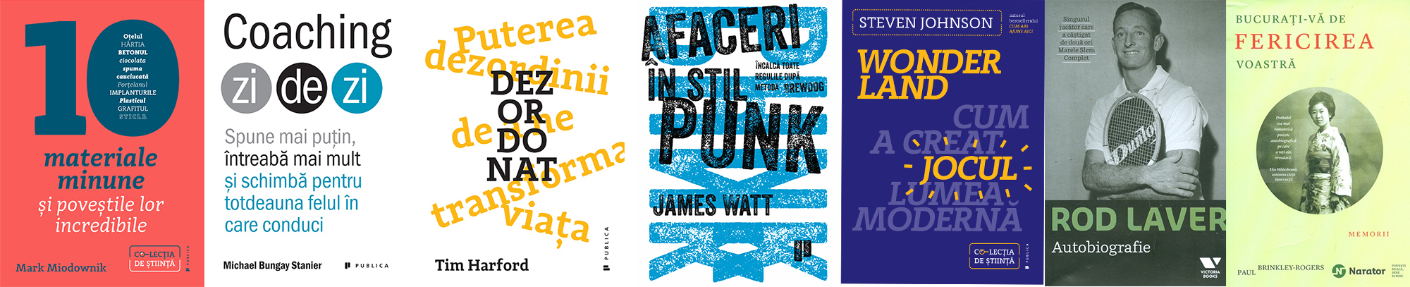 10 materiale minune și poveștile lor incredibile, de Mark Miodownik; Coaching zi de zi. Spune mai puțin, întreabă mai mult și schimbă pentru totdeauna felul în care conduci, de Michael Bungay Stanier; Dezordonat. Puterea dezordinii de a ne transforma viața, de Tim Hartford; Afaceri în ritm de punk. Încalcă toate regulile după metoda BrewDog, de James Watt; Wonderland. Cum a creat jocul lumea modernă, de Steven Johnson.