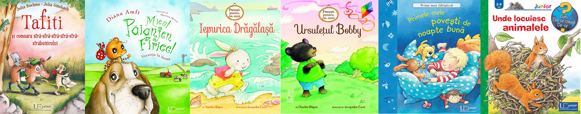 Tafiti și comoara stră-stră-stră-stră-stră-străbunicului, de Julia Boehme; Micul Păianjen Firicel. Vacanța la fermă, de Diana Amft; Iepurica Dragălașă, de Charles Ghigna; Ursulețul Bobby, de Charles Ghigna; Primele mele povești de noapte bună; Unde locuiesc animalele?.