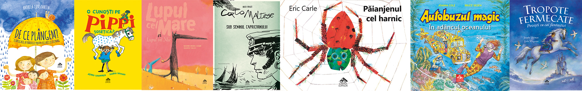 De ce plângem?, de Andreea Constantin, cu ilustrații de Maria Constantinescu; O cunoşti pe Pippi Şoseţica?, de Astrid Lindgren, cu ilustrații de Ingrid Nyman; Lupul cel Mare și Lupul cel Mic, de Nadine Brun-Cosme, cu ilustrații de Olivier Tallec; Sub semnul Capricornului, de Hugo Pratt; Păianjenul cel harnic, de Eric Carle; În adâncul oceanului,al treilea volum din seria „Autobuzul magic”; Tropote fermecate – antologie de povești cu cai fantastici.