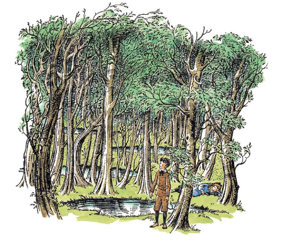 Se auzi un pleoscăit, iar copiii închiseră ochii. Dar când îi deschiseră la loc, erau încă în picioare, cu apa abia până la glezne, ținându-se de mână în pădurea verde. Apa nu părea să fie mai adâncă de câțiva centimetri.