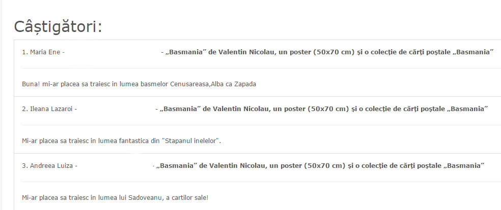 Iarna e un anotimp pe care-l asociem cu copilăria și cititul la gura sobei (în fine, a caloriferului) și, pentru a vă da ocazia unei astfel de evadări, am organizat împreună cu Editura Nemira un concurs de sezon ce are ca premii trei pachete ce cuprind: un volum din Basmania de Valentin Nicolau, alături de un afiș mare (50x70 cm) și o colecție de cărți poștale Basmania. Comparată de Eli Bădică într-un articol de pe Bookaholic cu tărâmurile imaginate de Michael Ende, J. R. R. Tolkien, J. K. Rowling ș.a., Basmania este o frumoasă lume imaginară în care cititorul se poate întâlni cu personaje precum împăratul Basmaniei, Băsmuitorul cel Cumplit, Infanta Hlizita, prințesa cea mică, Aricioșenia Sa, primul născut al regelui, Bosumflarea Sa, al doilea prinț, Pehlivan, măscăriciul imperial sau maleficul Tenebrus Ochi Roșii, directorul Casei de Nevisători.