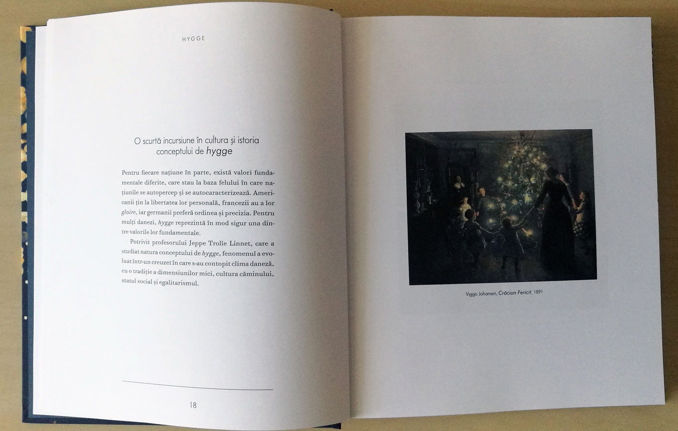 Apărută acum câțiva ani, moda hygge nu pare să fie doar o modă trecătoare, dovadă faptul că zilele astea a mai apărut un volum dedicat acestui concept danez al fericirii, și anume: Hygge. Arta daneză a fericirii, de Marie Tourell Søderberg. Volumul este apărut la editura LifeStyle, un imprint al Grupului Editorial Trei dedicat cărților de dezvoltare personală, și arată minunat. Coperta este cartonată, cu fulgii aurii și catifelată la atingere. Conținutul se referă la toate acele concepte care definesc această artă a fericirii și bunăstării pe care scandinavii par s-o fi desăvârșit. De la felul în care poate fi amenajată casa în stil hygge, la aranjarea colțurilor de fericire din casă, iluminat, rețete de mâncare, felul în care îți organizezi spațiul de lucru, socializarea, muzică hyyge, hygge în cele 4 anotimpuri etc., autoarea oferă, prin text și imagini, o nouă ilustrare a acestui fel de a înțelege fericirea.