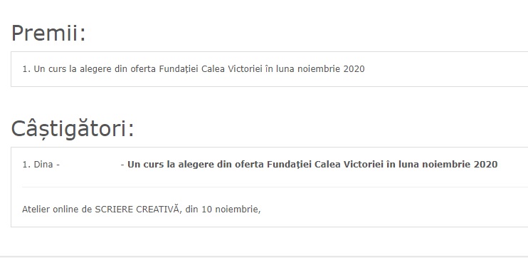 (Răspunsul este doar pentru participarea la concurs, câștigătorul poate alege orice curs care se desfășoară în luna noiembrie 2020 la Fundație, dar în limita locurilor disponibile; trebuie să fac precizarea că, deși sunt online, există și ateliere la care numărul participanților este limitat întrucât presupun interacțiunea lectorului cu fiecare participant în parte).