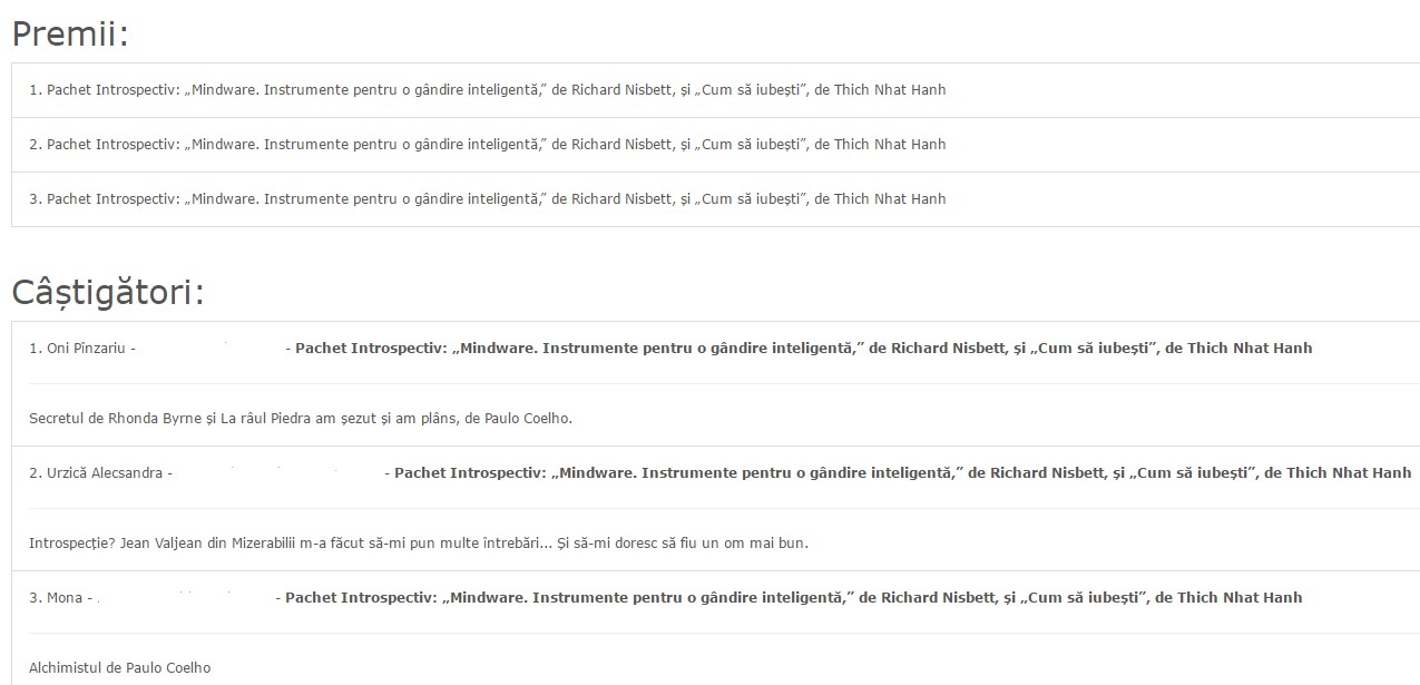 UPDATE: Câștigătoarele concursului sunt: Oni Pînzariu, Alecsandra Urzică și Mona. Felicitări și mulțumesc tuturor pentru comentarii!