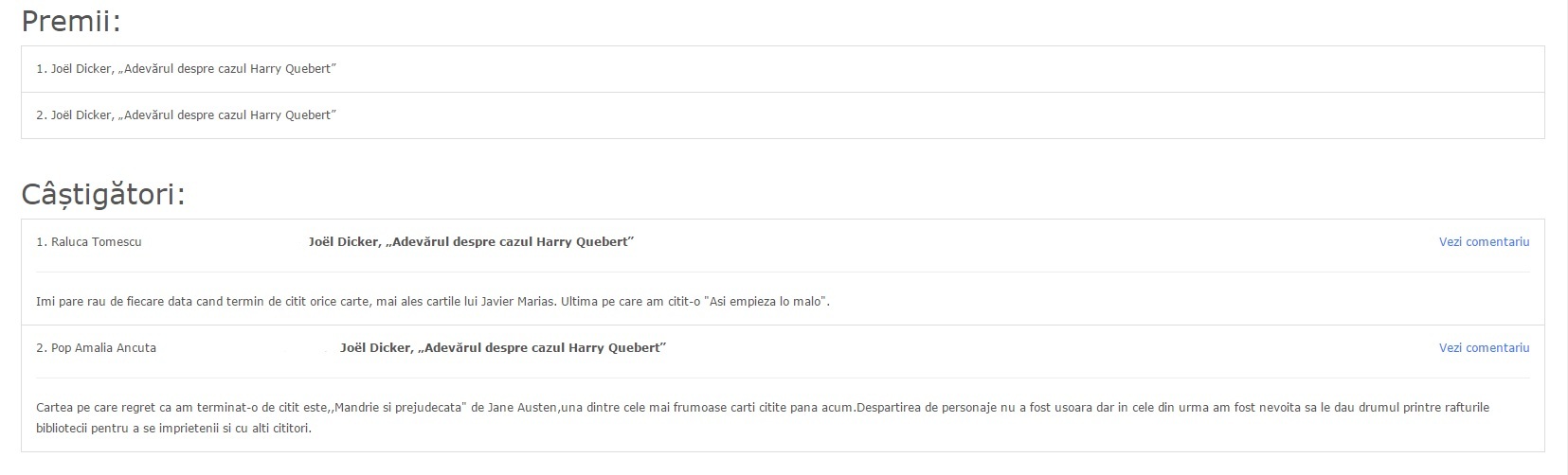Cel mai bine e să folosiți o adresă de mail validă pe care o verificați în mod constant, întrucât în cazul în care, timp de o săptămână de la anunțare, nu primesc răspuns cu datele de contact, voi face o nouă extragere. Câștigătorii vor fi anunțați de pe adresa book@lauracaltea.ro, așa că ar fi o idee bună să verificați și căsuța de Spam.