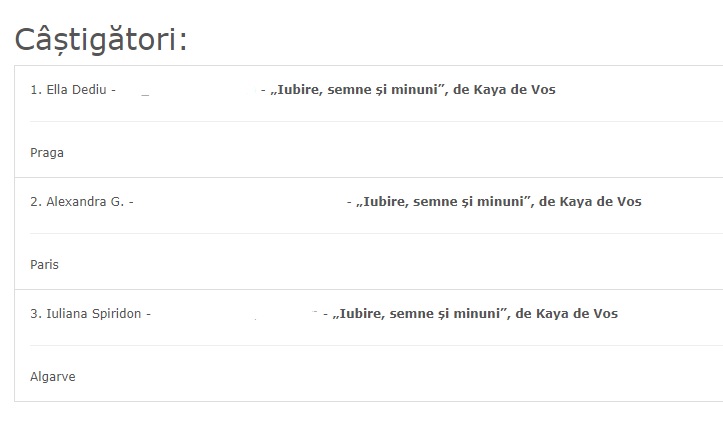 Aștept comentariile voastre de azi, 12 februarie, până duminică, 14 februarie 2021 (inclusiv). Vă rog să lăsați un comentariu în josul acestui articol în căsuța de comentarii (nu pe Facebook și nici pe mail la adresa de contact) pentru că toate comentariile trebuie să fie într-un singur loc ca să participe la extragere. Câștigătorii vor fi desemnați prin tragere la sorți și anunțat printr-un mail (e bine să verificați și în Spam) și pe pagina de Facebook Blogul unei cititoare de cursă lungă, luni, 15 februarie 2021.