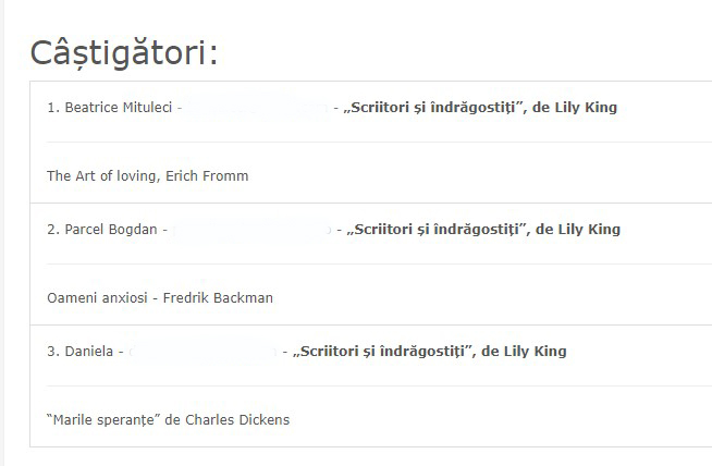 Aștept comentariile voastre de azi, 7 iunie, până duminică, 13 iunie 2021 (inclusiv). Vă rog să lăsați un comentariu în josul acestui articol în căsuța de comentarii (nu pe Facebook și nici pe mail la adresa de contact) pentru că toate comentariile trebuie să fie într-un singur loc ca să participe la extragere. Câștigătorii vor fi desemnați prin tragere la sorți și anunțați printr-un mail (e bine să verificați și în Spam) și pe pagina de Facebook Blogul unei cititoare de cursă lungă, luni, 14 iunie 2021. Din rațiuni de organizare, voi aștepta răspunsul cu datele de contact maxim o săptămână.
