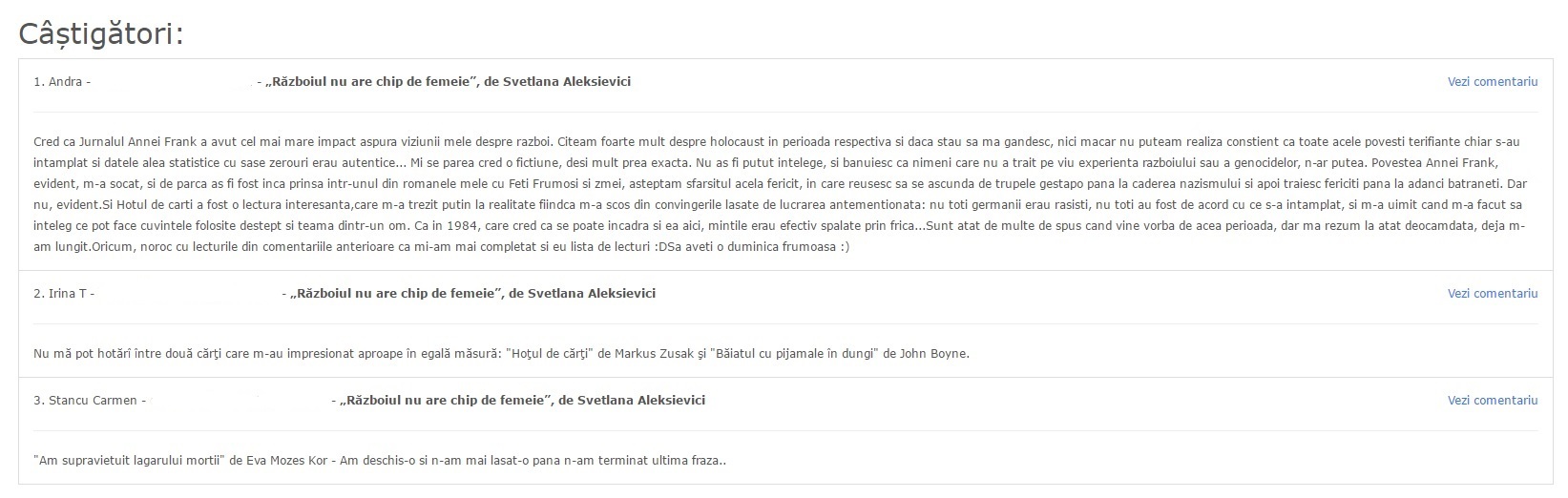 Pentru a face cât mai cunoscută această carte, am organizat, împreună cu prietenii de la Editura Litera un concurs ce are ca premii 3 exemplare din volumul Războiul nu are chip de femeie, de Svetlana Aleksievici.