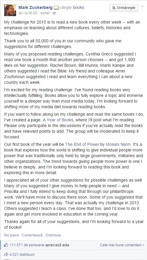 Fondatorul Facebook, Mark Zuckerberg, a anunțat că provocarea pe care și-a ales-o pentru 2015 este să citească o carte la două săptămâni pentru a învăța mai mult despre diferite culturi ale lumii, credințe, istorii sau tehnologii.