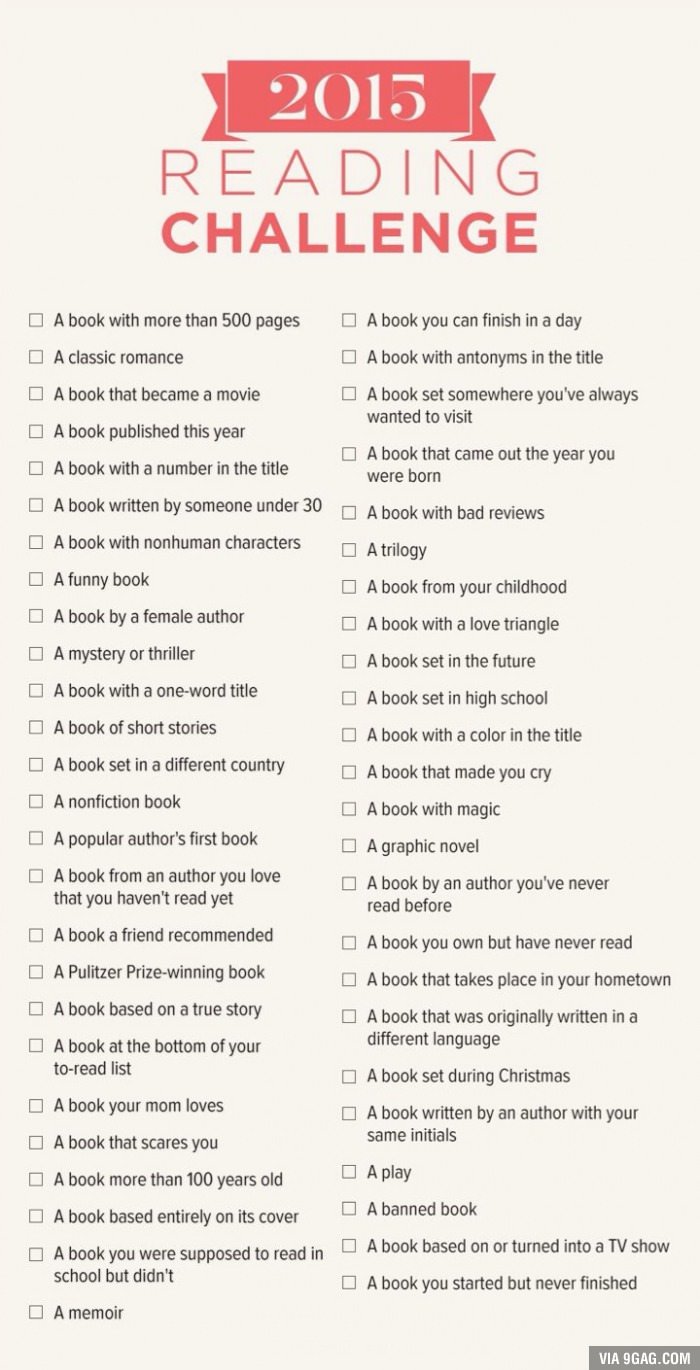 Voi aveți un plan de citit pentru 2015? Cărți pe care vreți de mult să le citiți și le tot amânați? Sau v-ați propus să citiți un anumit număr de cărți (eu am pus 104 pe Goodreads Reading Challenge). Dar liste, vă faceți? Din ce am văzut pe Facebook, 2015 a fost încă de la început un an al provocărilor literare. De la 1 ianuarie am tot văzut o imagine cu 2015 Reading Challenge care are mare succes. Sau am eu printre prieteni numai oameni care citesc cărți?