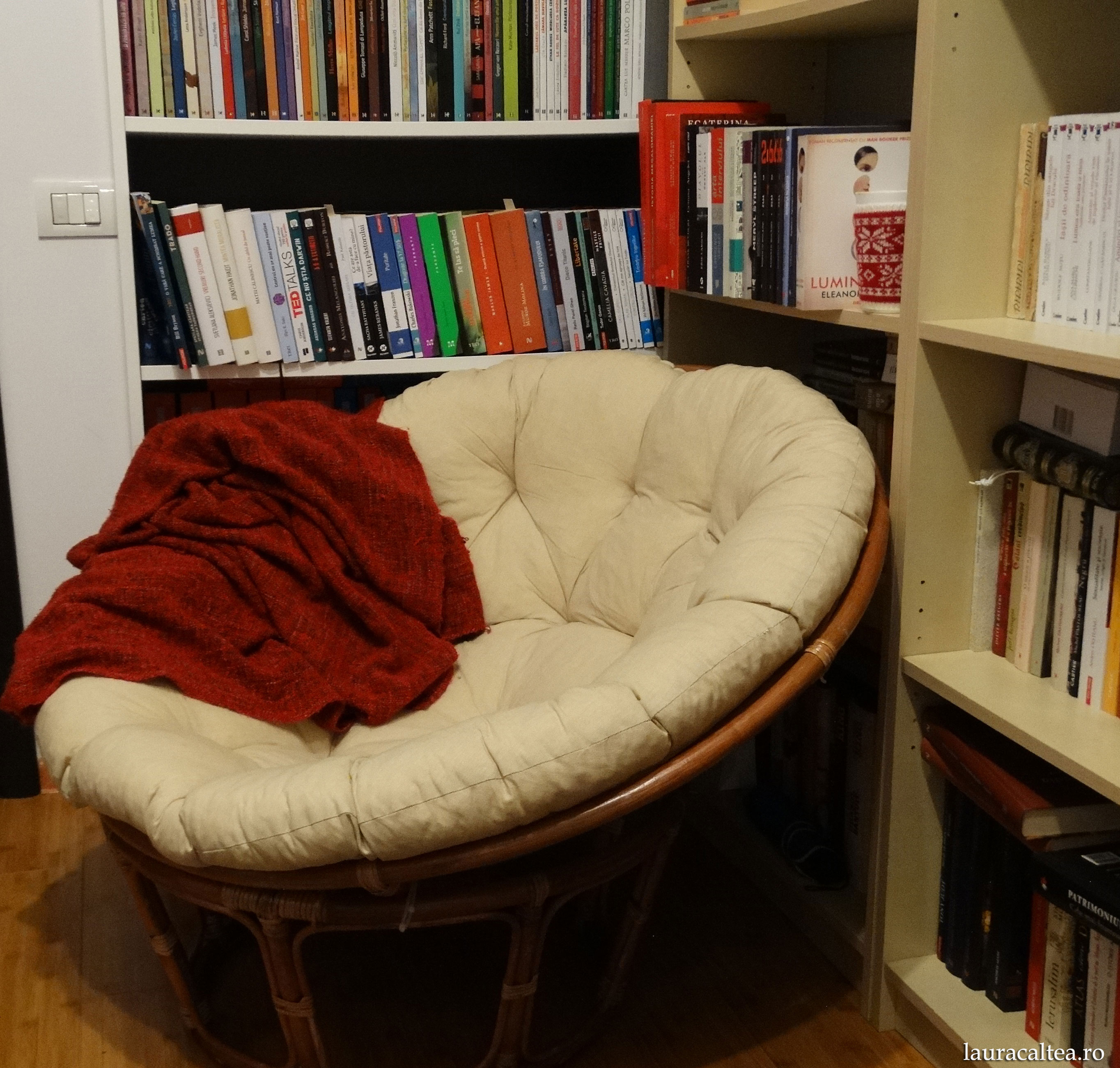 În general nu fac liste pentru că mă țin de ele, ci pentru că mă ajută să mă organizez. Mi-am propus ca anul ăsta să-mi fac zilnic program special pentru citit și să nu mai citesc așa de haotic pe unde apuc. Asta include și să închid laptopul și Facebook și să stau cuibărită în scaunul meu special de citit - sau, cum s-ar zice mai nou, în propriul meu hygge (vezi foto mai jos), cu o băutură caldă alături. Până acum nu am reușit să fac asta zilnic, dar perseverez. Și, având în vedere ce listă mi-am făcut, ar fi cazul să mă țin de program.