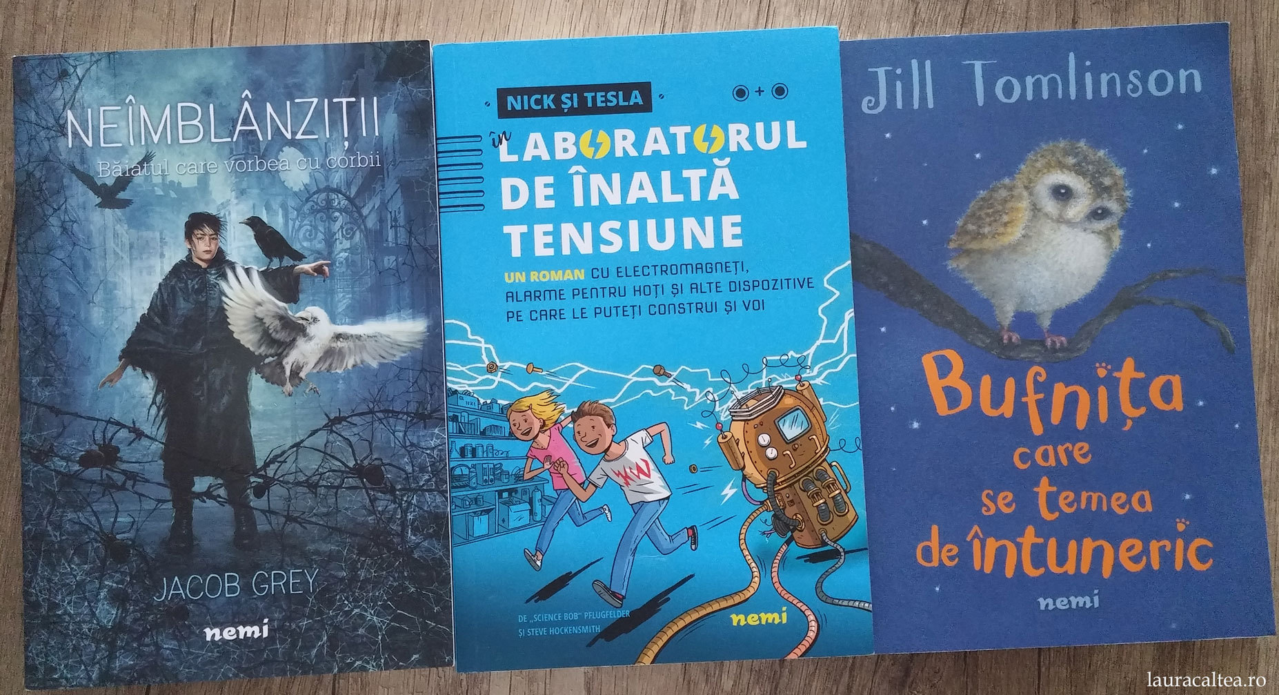 • Romane pentru copii. La Nemi au apărut în ultima vreme și mai multe cărți pentru copii, eu vi le-aș recomanda pe toate, dar mă stăpânesc și vă recomand doar Băiatul care vorbea cu corbii, de Jacob Grey (primul volum al unei serii fantasy plină de mister și supans), Nick și Tesla în laboratorul de înaltă tensiune, de „Science Bob” Pflugfelder și Steve Hockensmith (cartea perfectă pentru vacanță, cu experimente trăsnite și aventuri în aer liber, așa cum trăiau copiii pe vremea noastră) și Bufnița care se temea de întuneric, de Jill Tomlinson (o carte înduioșătoare și amuzantă, care să te facă să prinzi drag de cărți și de lumea animală încă de mic).